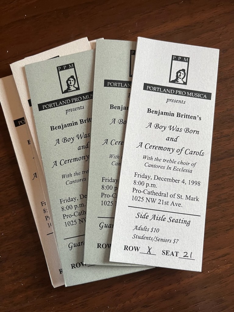 I’ve already been to a few Advent/Christmas concerts in Portland this year… a gorgeous service of Lessons & Carols by Cantores in Ecclesia, The Trio Medieval “Yule” concert, and the joyful Oregon Repertory Singers “Glory of Christmas” concert. This weekend I’m looking forward to In Medio’s “At the Holidays” program, and In Mulieribus’ contemplative program titled “In the Stillness”.
